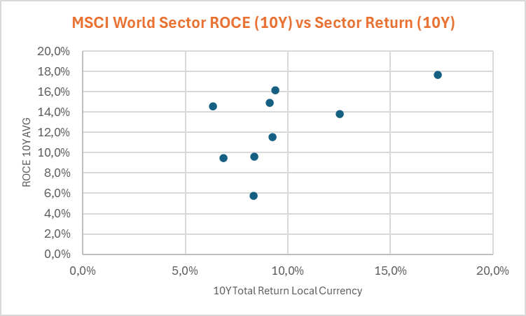 Bij de samenstelling van een kwalitatieve aandelenportefeuille moet het kaf van het koren gescheiden worden. Voor een eerste triage kan een zeef met gaten met een diameter van de kapitaalkost van de markt volstaan om in volgende fases dan fijnmaziger te werk te gaan, i.e. op sector- en bedrijfsniveau. Let wel, de ROCE is een kwaliteitsfactor, geen momentumfactor. Het verband tussen ROCE en sectorrendement op 5 jaar is nagenoeg onbestaande (figuur 3). Over een periode van 10 jaar is de relatie positief, maar de correlatie (0,55) blijft laag (figuur 4).