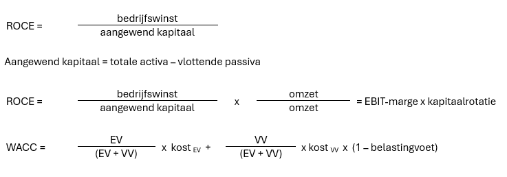 Resten dan nog de formules. Niet om de formules an sich, maar wel om de inzichten die ze bieden. Voor de ROCE wordt de bedrijfswinst (EBIT) afgezet tegenover het aangewend kapitaal. De vermenigvuldiging met 1(omzet gedeeld door omzet) onthult de twee knoppen die het management ter beschikking heeft om de ROCE te optimaliseren: de bedrijfswinstmarge en de rotatiesnelheid van het kapitaal.